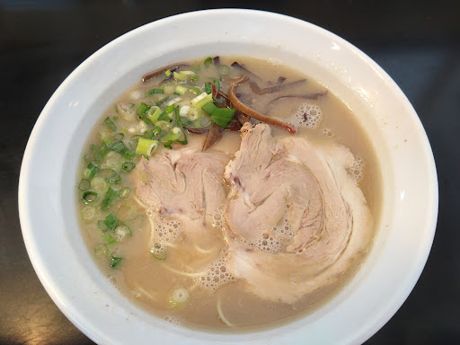 ストレート細麺は一見すると加水少なめな長浜系のようですが、口にするとモチモチ弾力があり不思議な感じ 僕は豚骨スープに合わせるモチモチ麺も好きですけどね 具材はネギとキクラゲとチャーシュー2枚、シンプルです