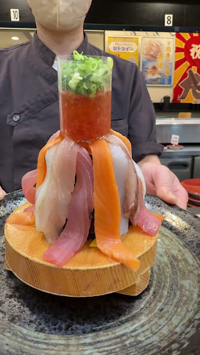 名物の「なだれ寿司」は、 そびえ立つ まぐろ、サーモン、いか、ぶり