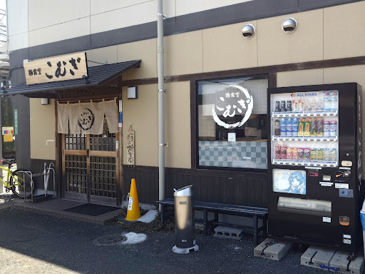 こむぎうどん980円、白むすびといなりを券売機で購入。 麺は、下関の定番細やわらか麺かモチモチ麺が選べるので、モチモチ麺をチョイス!