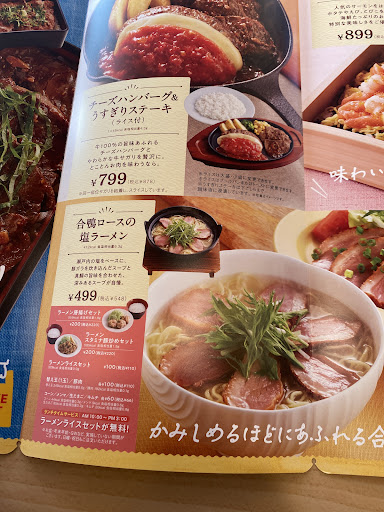Read more半年前と比べて料理が出てくる時間が早くなりました。コスパでのオススメはモーニングを除けば塩唐揚げ定食がジューシーで最強です。ハンバーグはソース変更も可能で好きな味が楽しめます。恒例の1人鍋が個人的には毎年楽しみです。ドリンクバーもコカコーラ系で種類豊富な方です。スープバーはコーンスープ含め3種類ありました。デザートも充実していているので、待ち合わせやたまり場としては最適です。ランチを除けば雰囲気は落ち着いていてゆったり過ごせます。トイレは男女各1つずつありました。支払いは現金・クレカ・Qpay・Edy・WAON・交通系カード・グルメカードが使えました。車椅子用のスロープもあります。駐車場は近隣の飲食店の中ではかなり広いですが、車のお客さんが多いのですぐいっぱいになります。喫煙所は駐車場にありました。テイクアウトも店内・電話・ネットで可能でメニューのリーフレットも入口に置いてありました。昔に比べてかなり値段は上がりましたが、それでもコスパはか...