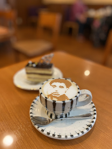 ケーキセットをカプチーノで700円 高杉晋作の顔抜きのカプチーノにケーキはショーケースよりコーヒークリームのオペラを。全体的に小ぶりでノスタルジックな仕上がりです。