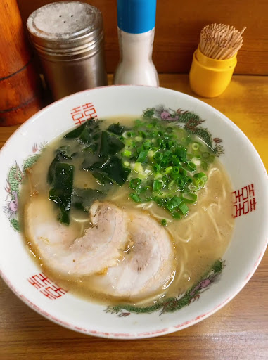 Read more本州の最西端になるとラーメンもとんこつがデフォですね 夜の道路沿いにぽつんとある、赤ちょうちんが無ければ通り過ぎてしまうようなお店 中はカウンターが6席の小さな造りで、レトロな昭和のラーメン屋 メニューはラーメンと餃子とごはん(むすび)のみ、ラーメン並とむすび2個を注文 ラーメンはとんこつだが、わりとアッサリしてクセが少ないタイプ、麺は長浜ラーメンよりは太くて柔らかめで自分好みではないかな、麺の固さ指定は誰もしてなかったから不可なのかな?そこにやや厚切りのバラ肉のチャーシューが2枚乗っています、このチャーシューは脂のコクが自分好み、メンマでは無くワカメが乗せられています、メンマは100円でのトッピングになります ゆで玉子がカウンターにあるボウルに入れられていて1個50円のセルフ方式、ラーメンに1個乗せて頂きました ラーメン+むすび2個+玉子で550円+140円+50円で740円と庶民に優しいお店ですね 人気店らしくカウンターは常に満席状態、店主1人で調理、洗い、会計と結構忙しいので、食べ終わったお客さんが空いた丼を配膳のカウンターに上げていたので...