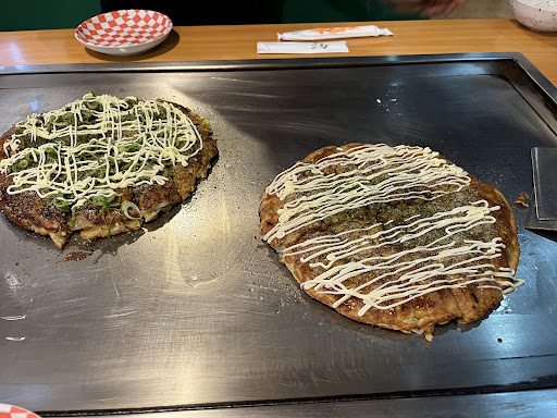 で、これが辛いだけで無くうまい✨ 山芋の練り込まれた生地はふんわり♪辛味は強いのですが豚バラや野菜の甘味、トッピングのチーズのコクと相まってハフハフ、うまうまです✨ これに青のりの風味、マヨネーズの旨味が加わりグットな一枚となりました^^ 最後は、鉄板の熱でカリカリとなる部分もグット❗️