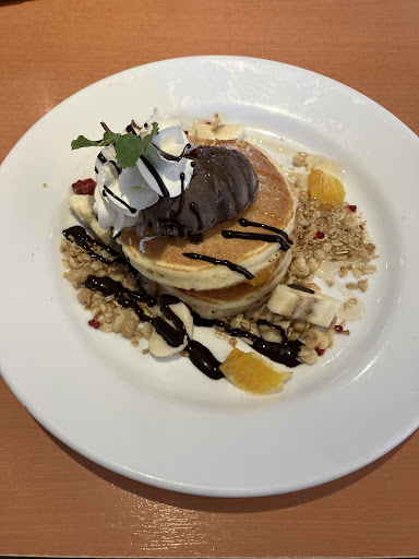 朝6時からオープンしていてありがたいです🙆店内スペース広々ゆったりしていて雰囲気良いです。席数も多いですね、駐車場もキャパあります! イチバン驚いたのは、モーニングセットのサラダの量です。我が地元、北久里の1.5倍はあるよコレ(@@) パンケーキの大きさも1.3倍❗ 首都圏立地でない店舗さんだと、このサイズになるのかな?いずれにしても🥞🥗🉐👍 それから、スタッフさんの気配りが立派で素晴らしいと思いました(^^) テーブルの上、グラスやお皿、料理に異常や不備がないか、よく見てくれていてプロ意識とおもてなしの心構えがすごいんです。グラス中の野菜ジュースの色合いが、ほんのちょっと薄かったその状況を、他の注文品を運んで来た時に直ぐに気付き、声をかけてくれたんです😊 確かにドリンクバーでジュースをセットして飲んでみたら、「少し薄いなぁ〜」とは思っていたんです。そしたらこの対応デス😽 直ぐに代わりのジュースを持ってきてくれました♪ 参りましたm(_...