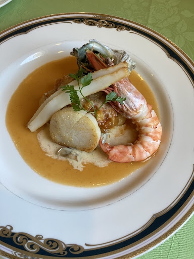 ゴールデンウィーク後半に予約なしの飛び込みで来店しました。 13:30頃に来店しましたが、快く迎えてくれました。 窓際の席に案内されました。中庭の花が綺麗でしばし見惚れていました。 私は海鮮、妻は肉メインのランチを注文しました。 自家製のパンに少し塩っ気の強いバターを付けて食べましたが、もうこれだけで大満足。 その後、カボチャスープとメインが運ばれました。 ホタテ、サザエ、シタビラメなどが盛り付けられており、見た目も味も繊細。 デザートはパインを基調とした初夏の彩り。これで美味しくない訳がない。