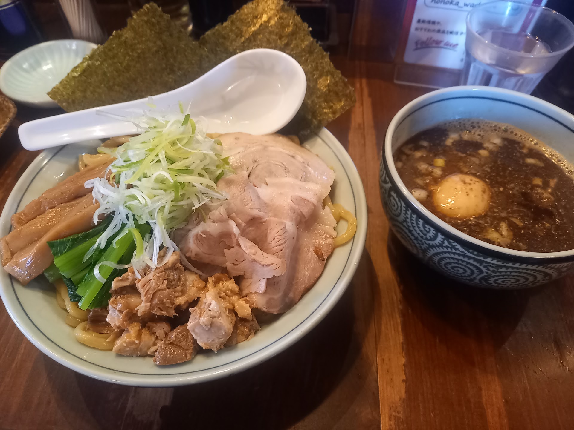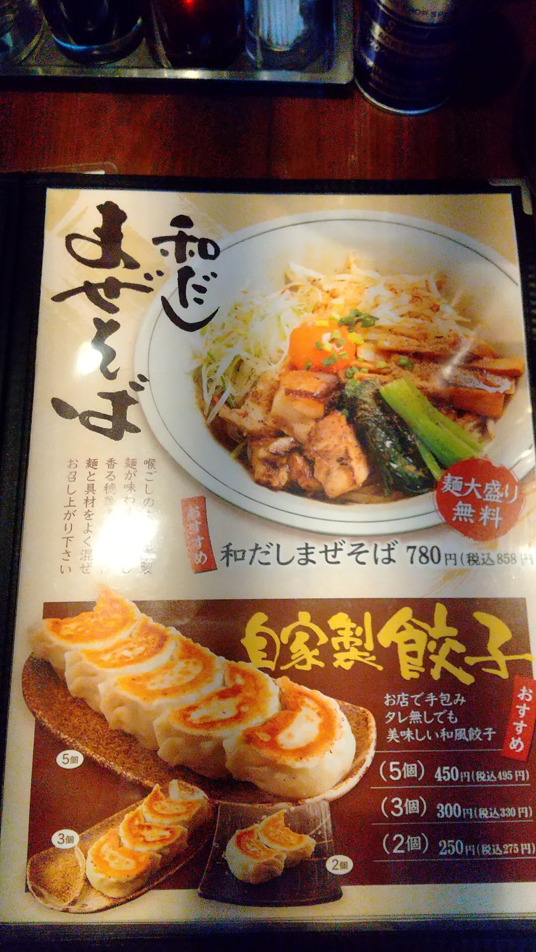 Read more和だし醤油らぁめんの看板に惹かれ、初めて伺いました。ちょうどお昼どきを迎える頃で、その時は並んではいないもの、私達が着席するときにちょうど何組か重なってきており、その後も途切れずお客さんが来て、帰る頃には待っているお客さんがいる状況でした。 私は特製和だしつけ麺の普通盛り、主人は和だし醤油らぁめんの餃子セットにしました。つけ麺は無料で大盛りにしてもらえるようでした。ラーメンだけど具だくさんで、チャーシュー好きには嬉しいラーメンです。味付けがしっかりしていて、柔らかいチャーシューでした。煮卵も半熟加減が好きなタイプでした。つけ麺の麺は全粒粉入のようで、もちもちとした太麺ですがツルツルしていて美味しかったです。つけ麺のつゆなので味は濃く感じましたが、節が強い感じのつゆで、最後まで薄まらずに美味しくいただけます。主人の注文した和だしらぁめんはお出汁の味が効いていましたが、つけ麺とは違って優しい感じのスープで、麺は細麺の縮れ麺で、こちらも美味しかったです。餃子はぷっくりと一つが大きな餃子で、具材は細かく刻まれてしっとりしたお野菜たっぷりで美味しいです。餃子セットだと2個ですが、ラーメンとセットだとライスの分もあるので2個でも十分な大きさな気がします。 店員さんが全員女性なのはわざとだったのでしょうか。たまたまだったのでしょうか元気な掛け声が飛び交っていました。席はカウンター席とお座敷席があり、たくさんではありませんでしたが、お客さんの回転は良いように思いました。 お会計はクレジットは使えず現金でのお支払いです。 今回たまたま見つけたお店でしたが、またこちらの方に伺うときはお邪魔したいです。塩の...