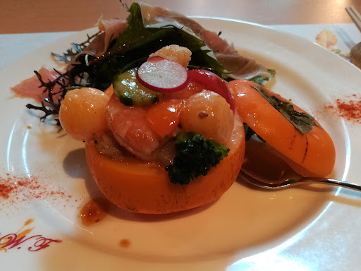 ビストロ ウッドファーム、ひっそりと佇むお店ですが、 地元では知る人ぞ知る、週末はいつも満席の人気店です。 今回はレディースランチを頂きました。 オードブル、メイン料理は2品から選択、スープ、デザート、ドリンクで2000円、+α円でメイン料理を特別メニューに変更できます。 とても良い料理内容でリーズナブルです。 この日のコース、 旬の食材の柿と海鮮のオードブルはビー玉大にくり抜いた柿玉にエビやホタテが海鮮香る自家製ソースにからめていて盛り付けも芸術品の様に美しく繊細でした。 追加料金の海鮮グラタンはホタテの貝柱が贅沢にゴロゴロと入っていて素晴らしい香りと共に必ず食べたいメニューです。 牛のザブトンステーキは柔らかく香り良い一品。 チキンのグリエは香ばしく食欲が進み、ハンバーグは小ぶりでもスパイスと挽き肉の香りと食感と共に肉汁が食欲をかきたてます。 コーンスープはサラッとスッキリとした食感ですが、コーンの風味が素晴らしい一品です。 デザートもしっかり美味しく、男性でも満足のレディ...