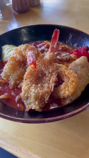 海の幸トマトソースオムライス海老フライ付(1,450円)をオーダー ビジュアルはインパクトあり ただ、味は期待を上回る事が出来ませんでした ごめんなさい トマトソースは非常に水っぽく酸味やコクは無し ソースに入る小海老とアサリも全く旨みが出ていない 薄焼き卵に包まれたチキンライスはベチャついており味も薄味リアルケチャップライス トマトソースが状態も味も水っぽいのでダブルで印象薄い フライはエビ2尾、イカリング、白身魚だがスーパーの惣菜を温め直して食べている感覚 素材の味も感じず正直美味しくない ライスの量は多めだが、味がハマらなく途中から炭水化物を胃に送るだけの作業になってしまった 港町だけに本物の海の幸を堪能させて欲しかった 決済は各種電子マネ...