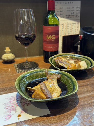 あえて1枚目はサービスのあらだき🥹 これがもう出汁の甘みが美味しすぎる🥹🥹 刺身も煮物もご飯もどの料理も文句なしの美味しさ♡ ワインボトルがリーズナブルだったので ボトルで乾杯もして大幸せ♡♡