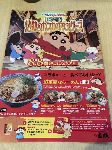 久々の虎鉄さん、しんちゃんコラボチャレンジ!の為、ランチで訪問! 超華麗なエビらーめんで、麺半麺煮卵をチョイス+トンカツ定食、連れは超華麗ならーめんでオーダー! 席に着くと専用の箸とシールのプレゼント🎁 10分ほどでまずはらーめんが着丼、ここで事件発生! 半麺と言われて、え?普通頼んだけど、のやり取りののち、券を見せられて納得! あらぁ、煮卵0円てところだけ目に入ってて、麺半麺見過ごしてたわぁ😅 お騒がせして申し訳ない🙏 で、らーめんの話、お、良い香り👃どうしようか?と、連れと悩みつつも、ここは一気に混ぜ混ぜだろう!ということで、しっかり混ぜ混ぜしてからスープを啜る。うん、これ良いかも!美味い😋 連れが、カレーラーメン初だけど、美味しんだなぁと感心! で、トンカツ定食が到着!勢いで一口、あ、写真だ😅と言うことで食べ掛けの写真です… トンカツは思ったよりしっかりした一人前だなぁ ラーメン丼にドボンしてカツカレー風に、うん、美味い😋 けど、結果半麺で大正解だったなぁ!半麺じゃ無かったら、動けなくなってるとこだ! ちょうど良い塩梅で完食!スープが美味くて完飲してしまったー エビじゃ無い方のスープは、エビに比べるとあっさりな感じ!と言うか、エビの方が濃厚なんだなぁ、参考までに 満足なランチで...
