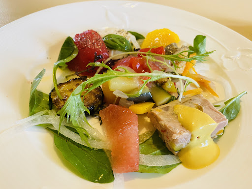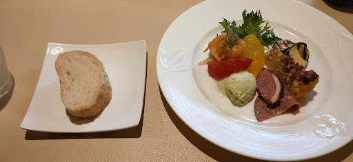 前菜…彩りがよく 魚、肉のパテ 甘いトマトと 質の良いモッツァレラチーズ 冷製ラタトューユ オレンジ、グレープフルーツの カットが口変わりになり 口の中がさっぱりと 全体的にバランスの良い一皿 優しい味わいにまとまっている