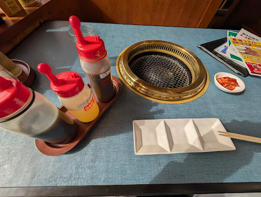 平日のランチ時間に訪問しました。 昼から肉を食うなんて自分には贅沢です。 ですが、ランチメニューならギリ何とかなるかもと訪問しました。 片付けされていないテーブルもあり、混んではいませんが肉が大好きな方は多いんですね。 1000円以下のメニューもありましたが、平牧金華豚バラ焼き1100円を注文しましたた。 しばらくして配膳され、写真を撮るのを忘れるくらい、豚バラ肉2人前のビジュアルに衝撃を受けました。 冷凍スライス状態ですが、網の上で焼かれていくと、バラ肉の脂が溶け出し炎が上がります。 皿の付けダレに何度か付けると皿に脂が溜まっていき、油に肉を付けて食べる様な感じになります。 大変満足しましたが、後半戦はバラ肉の油でやられるくらいな...