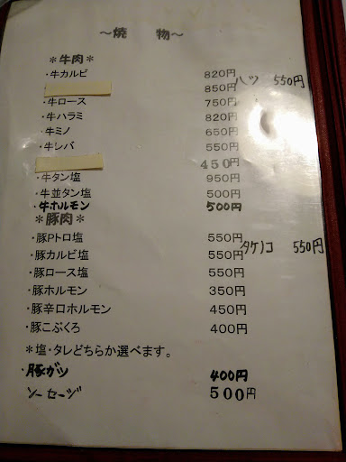 他の口コミでは店内が油で少しべとつくとのことでしたが私が訪問した時は特にそんな感じはありませんでした。 後メニュー表が他の口コミの方たちのものと変わって新しくなっています。イラスト屋のイラストも使われてて何だかいい味が出ていて私は好きです。 店内は思っていたよりも奥行きがあって広く感じました。宴会も予約できるとのこと。 味付けがタレとコチュジャン?しかないのが少しもったいなかったです。個人的な好みで言えば塩とか置いてもらえると嬉しい。 塩気が欲しい人はトッピングメニューの味つきオニオンや一品料理のニンニク醤油と一緒に焼肉を食べるのも良いかもしれません。 肉やその他のメニューの味に関しては普通に美味しかったです ※と言うか色々食べ過ぎて何がどう美味しかったのかもう覚えてないです。 鶏もも肉のサービス貰えたのはちょっと嬉しかったです。 個人...