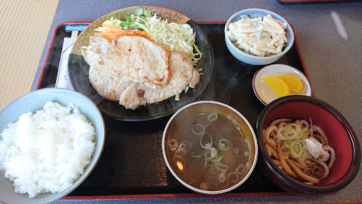 オススメの゛肉スタミナ焼゛(定食?)を頂きました。優しい味付けの大きな豚の焼肉に、お味噌汁、冷たいうどん、マカロニサラダにたくあんがついて来てボリュームが御座います。久しぶりにお腹いっぱいに昼食を頂きました(汗) ※食後にはさら...