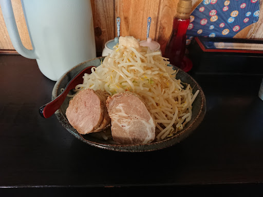 Read more以前、ニラなんばんラーメンが主役の時代に何回か来たことはありました。 そしてかなり久しぶりの訪問になりましたが、豪めんを食べてみたくて再訪問です。 券売機のメニューを一通り見てみると、超豪めんなるものがあり、店員さんに聞いてみると、チャーシュー一枚の豪めんが2杯分とのこと。ダブルと言っておりましたが、麺量が300gということだったので超豪めんニンニクのみで注文です!笑 土曜日の昼時でしたが、駐車場が混んでいたにもかかわらず、半分くらい席が空いてました!相変わらずとなりの回転寿司が混んでるんですね(--;) それで10分も待たずに着丼です。 どんぶりかなりデカイ…。 しかも野菜がかなり多い…。聞いてみると野菜は1kgとのこと…(^^;) 麺量300gに対して野菜1kgとは…💧 食べれるか不安になりましたがひとまず頑張ります!笑 まずはスープから飲むと、脂のせいか甘く感じます。結構以外な味付けでした。 野菜はほとんどがもやしです。キャベツはかなり少ない。でもしゃきしゃきで美味しいです! 麺はちょっとだけ太麺ですね。序盤はコシもありましたが、後半は麺がのびきってました…。 豚はかなり厚い。4cm以上ありそうで厚さだけなら県内一ではないかな~。それが2個も入ってます! でも冷たい…。そのままスープに浸けてても温まらないので、細かくして温めるといい感じになります。豚はしっかり味が付いており、柔らかく食べやすいです。 スープが以外にも薄めなので、豚のしょっぱさにかなり助けられました。 スープのカラメ設定がほしいところです。 なんとか完食しましたが、かなりツラいです。今度は味噌だな...