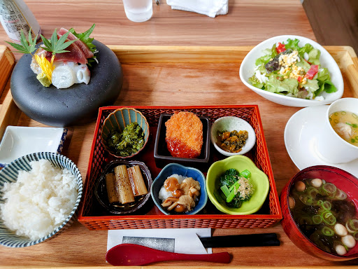 「人と木定食」をいただきました。 人と木定食はコーヒーとデザートもセットになっていました。 定食はおかずが多く華やかな定食でした。 自分の訪れた際は、刺身、兜焼き、サラダ、茶碗蒸し、小鉢6点、汁物と色々な料理が楽しめましたし全部美味しかったです。 特に魚の兜焼きは、脂がのっていてトロトロした身で美味しかったです。あまり食べる機会がない部位を楽しめました。 サラダは無農薬の野菜のサラダのようでこだわりも感じられました。
