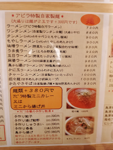 25年程前、白河市内の営業所に単身赴任していた頃、残業で遅くなった夜に時折立ち寄って酢豚定食やギョウザ、唐揚げなどを食べるのが楽しみでした。当時安月給+単身赴任で家計は厳しく自炊が基本でしたが深夜に疲れて帰宅してから料理をするのはしんどい日もあり、そんな時には遅くまで開いているアビラでご褒美飯ということで、たまの外食をしていたのでした。 6月のある火曜日所用で白河に行く機会があり午後1時40分頃に寄らせてもらいました。お店の佇まいは四半世紀前の記憶と変わらず懐かしく感じました。 好物のカツカレーを注文したところ、ごはんを大盛りにできますよということだったので、大盛りを頼みました。 出てきたカツカレーは、ごはんだけ大盛りではなくてカレーも大盛りに思えるものでした。 けっこうなボリュームでしたがカツもカレーも美味しくて満腹満足の一品でした。 今回食べたのはカツカレーでしたが、他の料理も美味しいに違いないと感じさせられました。 お会計の時、お店のポイントカードはありますか、と聞かれ、持ってないです実は25年ぶりに来たんです当時仕事で遅くなった時に寄らせてもらってましたお店まだあって良かったですとお話ししたところ、あらそうなんですか父がやっていた頃にいらしてたんですね7年前に父が亡くなって店を閉めたんですけど4年前に再開して父に教わった料理を出しているんです昔は深夜まで開けてましたからねということでした。 またいつ来れるか分かりませんでしたがポイントカードをもらい、いつかまた来ようと思いながらお店を後にしたのでした(外に出たら突然の豪雨で傘は持っていたものの小降りになるまでの10分ほど軒先で雨宿りさせてもらいながら白河に住んでいた頃の思い出に浸...
