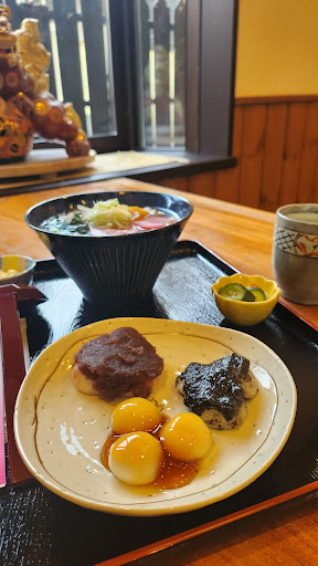 Great cafe by Nanko in Shirakawa, right by the entrances to Nanko Shrine and Suirakuen. I had the Nanko udon set as lunch, all of which was delicious, from the udon to the three sets of Nanko dango. The cafe has a nice, comfy interior, with a mix between standard and tatami seating. Service is warm and friendly. Pretty quiet on the weekday afternoon in the winter...