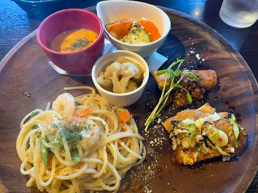 ウポポイのある白老町。国道36号線沿いにあるこちらのお店は常に駐車場に車が止まっていて気になっていました。事前にランチの時間で予約を入れて訪問。3組ほどお客さんがいましたが、見回すとまだまだ席に空きがあります・・・が、私たちの後から来たお客さんは予約なしで来ましたが、カウンター席のみ空きがあるとのこと。ほぼ予約で一杯ですね、週末のランチは予約必須かも。注文は事前に確認していた「1プレートランチ1,800円」を注文。1つのプレートにお店のオススメが全て乗ってくる、プレートですね。選べるのはドリンクとデザート。ドリンクはビールやワインも選べますが車で来ているので「HOTカフェラテ」で。そしてデザートは、本日提供されているケーキ一覧を持ってきてくれて、その中から選びます。店員さんに聞くと、イチゴのショートケーキがオススメとのことでそちらをチョイス。席から厨房が見え、期待が高まります。着席して10分程度でプレートが運ばれてきました! バスタ(小えびとアスパラのオイルソース)、肉料理(とりもも肉とキャベツのロースト)、魚料理(白身魚のソテー)、TAPAS①(パンツァネッラ)、TAPAS②(アンチョビカリフラワー)、スープ(人参ポタージュ)、見た目も楽しい。パスタはアスパラが素晴らしいですね。そして一番良かったのは白身魚のソテー。白ワインソースのサッパリ感が白身魚とマッチしております。この魚料理をメインに白ワインが飲みたいです! 1プレート、美味しくいただきました。そして食後のデザート、イチゴのショートケーキが運ばれてきました。正統派のショートケーキ! 甘すぎない生クリームにイチゴの酸味のバランスが素晴らしですね。これならもう2,3個食べられそうです(笑) カフェラテも、しっかり食後のお腹を落ち着かせてくれました。多くの料理を楽しめ、満足度が高いです。次回は・・・ピザのランチですかね。色々チャレンジしたいで...