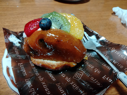 生クリームとフルーツでキレイにデコレーションされていて (ふつうは地味メシのはずの)サバランが華やか。