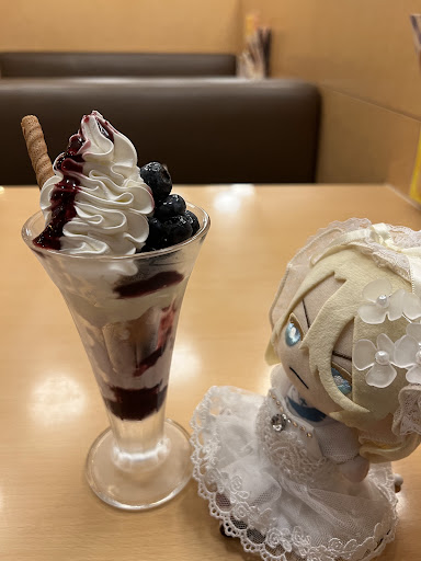 夏メニュー🌺ばかり取ってます! ブルーベリーパフェ⇒ホイップクリームの盛り付け方が綺麗😍全体で1つのケーキみたいに楽しめました!ホイップと生ブルーベリーと玄米フレークを同時に食べるとブルーベリーケーキそのもの😍酸味も強く、爽やか・ジューシーで何度食べても飽きません。他のファミレスにはブルーベリーパフェが無いので、ここに食べにきたくなります🫐 ニンニク醤油ハンバーグ⇒ニンニクしょうゆソースとご飯の相性良し、とにかくご飯進む🍚そしてこのソースの味と香りが強くて良き! 出汁茶漬け海鮮丼⇒ご飯大盛り無料、いつものネギトロにサーモン、イカ、かずのこが乗ってます🍣海苔とわさびとわけぎねぎが別添えになっていて、出汁がついてきます。出汁をどのタイミングでかけようかな〜と思ってるうちに全部しょうゆで食べちゃいました‼️ つけめん⇒麺太め。ご飯は高菜と明太子とマヨが乗っていて味が濃すぎるため、単品にて注文。ジョイフルの麺は硬め太めで喉越しも良く、つけめん専門店に負けないくらい(か、それ以上)美味かったりします😍スープは鰹節が入り、魚介出汁が強く香ります🐟