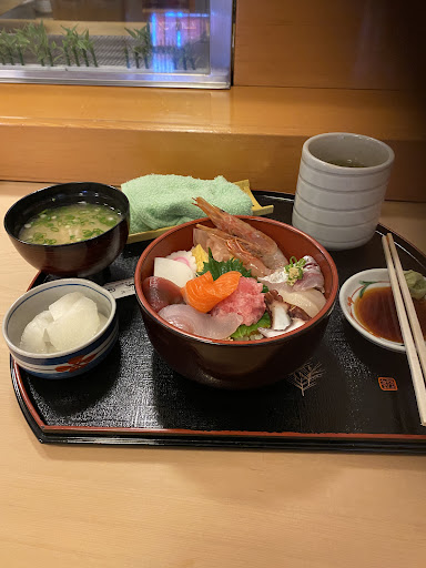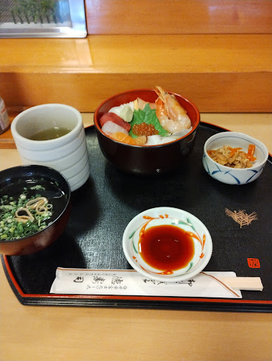 海鮮丼を注文。 手際よく10分も待たずに着丼。 お吸い物とお新香付きです。