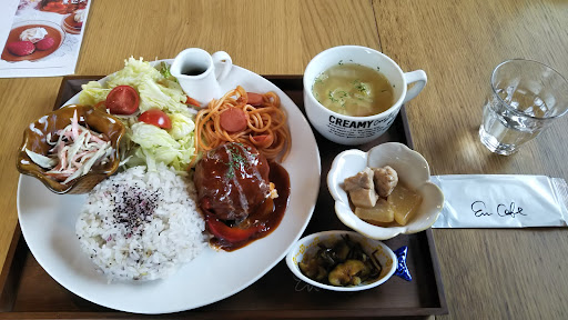 ランチでおじゃましました。 お勧めランチセットを注文。 サラダ・小鉢・スープ・ドリンク・デザート付きです。 この日のメインは煮込みハンバーグでした。 ご飯は大盛りでしたが、煮込みハンバーグや小鉢などのおかずが美味しくて完食しました。お腹一杯です! デザートは パフェで量もあり盛り付けも可愛らしくて驚きました! 店内は 可愛らしい壁紙や小物や絵が飾ってあり 居心地がよい空間でした!