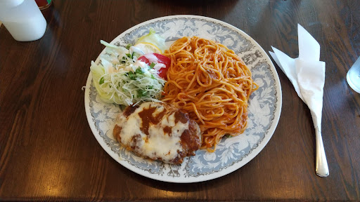 メニューは安いですね。 ナポリタンが580円。 せっかくなのでハンバーグスパゲッティー(チーズ乗せ、サラダ付、税込800円)を注文。 10分もかからず出てきました。 小さいハンバーグとサラダが一枚の皿に乗ったスパゲッティー。 美味しかったです。 食べるとめっちゃボリュームがあります。