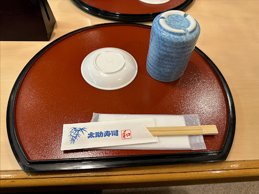 忙しい時間かなと思ったけど、雨天だったのもあってか2、3組しかいなかったのですんなり入れた。 店員さんがカウンター中に居て、その周りをくるくる一応回転レールが動いてる。 寿司は乗ってないけど、これ動いてないとなんか廃れた感じがするから動いてるのは正解だと思う。