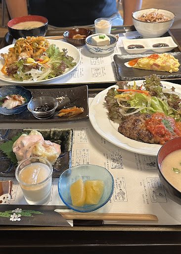 ■発酵(つながり)ランチ 2310円 ・酵素玄米 ・食前酒 ・主菜 - 塩麹玉ねぎの肉ゴロゴロハンバーグと秋野菜のソテー - 海老のしば漬け甘酒マヨネーズのせ - そうめん - 果物コンポート - 発酵盛り合わせ(ハリハリ・酒粕漬け・刺身&醤油麹・もろみ) ・粕汁...