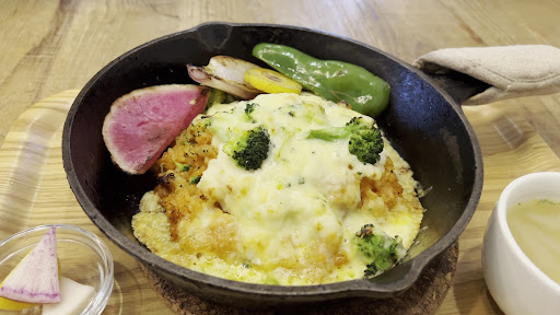 そしてドリア。 スキレットであつあつで提供。 チーズがたっぷり、とろけたチーズがカリカリになっててコレもよし、 ドリアはチキンライスでべっちゃりということもなく、チーズとの相性や味付けもほぼ完璧。 この凝りようなら無骨にチキンライスとかのネーミングじゃなくもうちょっと洒落込んだメニュー名にした方がいいような。。。