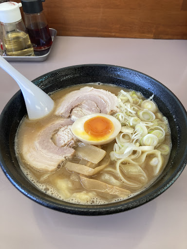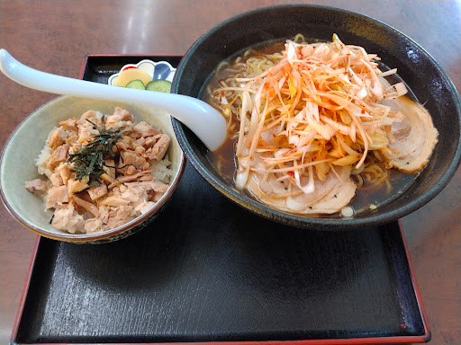 Read more2025/07/27 13:25頃到着。駐車場は2台空きがあったから停めることが出来た。店内に入り席を案内され座る。口頭で注文するスタイル。しばらくすると店員さんが来てくれた。ネギブラックラーメンとセットメニューのミニチャーシュー丼それと手作り餃子を注文。麺は細麺ちぢれ麺。スープに絡んで美味しい。辛ネギが乗っていてしっかり辛味があり良い。麺をすくった時に黒い粒が付いていてよく見たらコショウだった。コショウまで麺に絡んでくるのか。麺の量は多め。大盛もあるけどそこまでは今回は食べないかな。ミニチャーシュー丼は醤油系の味付けされたチャーシューがご飯に乗っていて美味しい。餃子は皮はもちもち食...
