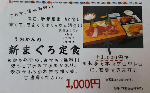 Read moreThe Maguro Teisyoku (Tuna Set Menu) is only 1000yen, but you’ll get the whole range of maguro meal including sashimi, deep-fry (tempura-style), grilled with sauce, miso soup and rice. I was surprised at the volume that you get, and if you can eat more, you can ask for extra grilled or deep-fry maguro for free. The set menu is provided in a limited amount each day, but other set menus are also available. I recommend that to get here before 12pm to get a seat, otherwise it may be a...