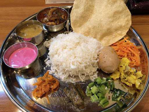 まずは、混ぜやすくするために、カトリ(小皿)を外に出し、ライスをくずして、パパドを割って、ライスにかけます。菊芋のベジカレー、辛さはほとんどありませんでした。骨付きマトンのノンベジカレー、お肉が柔らかくて美味しいです。卵のアチャールも辛さはほとんどありません。カレーをかけたら、お皿いっぱいにべちゃべちゃになってしまい、大きなお皿を傾け、何とか体裁良く食べられたかな。辛さは少なく、美味しかったです。マサラチャイはちょっとショウガのような味もあって、メチ...