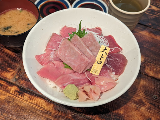→赤身、中トロ、大トロ、マグロの竜田揚げ、味噌汁