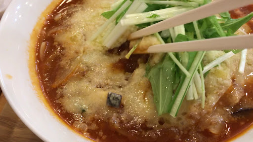 頼んで10分エビ生クリームが着丼 先ずは一口(´ 3`)これはねまさしく トマト100%スープです✨👍 塩 醤油 味噌 ベースがあるけど これはトマトがベースと言うかスープと言うかそんなラーメン ちょっと辛みがあって激辛好きな私好みです 子供にはちょっと辛いかもそんな時はトッピングのチーズを入れて食べると気にならないと店員さんも言っていました ぷりぷりのエビに味の決め手の魚介と合わさった野菜もタップリ 麺はカッペリーニ位の細麺ストレートです 結構食べごたえ有るけど〆にライスはこのお店では定番らしいです( ゜o゜) 今日は2戦目が有るのでライスはスルー 途中でトッピングに頼んだ チーズとバジルソースを導入!! ここで失敗に気付くΣ(゚д゚;) バジルソースは思ってたよりチーズ寄りの味でバジル好きだからちょっとガッカリでチーズも入れたらクド過ぎた💦もっと生バジル感が有ると良いのに_| ̄|● (ノд`)σ店員さんに聞けば良かったね💧 次の品を待ってる間に口の中お冷やでリセット ここのお冷やなんと抹茶入りです👍 めちゃくちゃ美味しいんですけど♪(´ε`*) この抹茶を麺にも入れることも 有るんだって 今度食べてみたいな( ´∀` )b 冷やしイカスミラーメン着丼 早速一口!!(゜ロ゜ノ)ノ 何を食べてるのか味がしないと言うか 魚介ベースの野菜と ドレッシング?が合わないのか┐('~`;)┌ 味がボヤけてパンチがなく よくわからないまま中盤に( o´ェ`o) トマトの味がないんだけど?💧 そう言えば店員が脇に添えられたレモンのジュレ?お好みでって言ってた…導入!!! 劇的に美味しくなった( ´∀`...