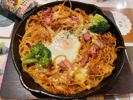 普段、関東住みで色々外食しますが、トマトソースが美味しいと感じる店、ベスト3に入ります。 少し甘みがあり、ソレが麺にしっかりと味付けされてます。 味は昔ながらのなナポリタンですが、麺は普通のパスタ。 目玉焼きとチーズがのり、それがスキレットで焼かれています。 かなり美味しいです。