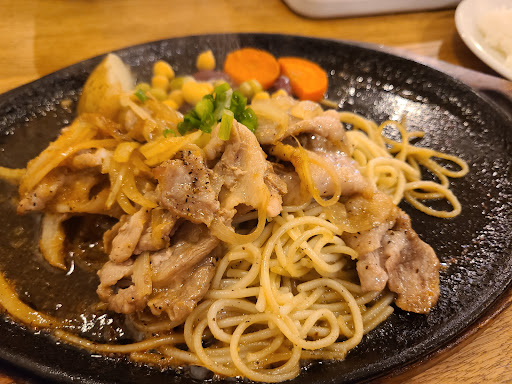 駐車場は店舗正面にあり、店内はカウンター席やテーブル席が並ぶ造り。 このタイミングで家族連れ2組で賑わっていた。 12月にリニューアルオープンした事は知っていたが、今回ようやく訪問。 以前より席数は半分くらいに減ったが、カウンター席ができて居心地が良い空間が広がる。 いつもはパスタ系の注文する事が多いが、この日はかなり久し振りにこのメニュー。 生姜焼きではなく、生姜焼き風に甘いタレを豚肉に絡めて焼いたもの。 その下にはたっぷりのスパゲティがあり、これがまた汁を吸って美味しい。 サラダは南瓜味のマカロニにフレッシュな野菜が盛られ、これが100円なのは嬉しい。 次はまたデカ盛りのパスタを目当てに訪問したい...