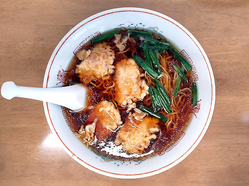 具は肉天、ニラ。チャーシューの類は乗らない。いつもの味玉はメニューにない。 肉天はチャーシューに衣を付けて揚げた印象で、肉質と形がチャーシューに酷似している。 青物はニラのみでネギすら乗らない。 先日、海老天を乗せたラーメンを食したばかりだが、流石に肉天では舌がバグる感覚はない。