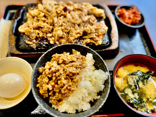 こちらの店はかなりオペレーションが考えられていて、券売機で購入すると注文メニューの肉を鉄板で焼きお盆の上に乗せてくれる。横にスライドしてふわふわに盛られる自動ご飯機のボタンを押してご飯をよそう。 背面に味噌汁サーバーと野沢菜、キムチ、塩辛、そぼろ、生卵をおかわり自由で持っていけるスペースがある。