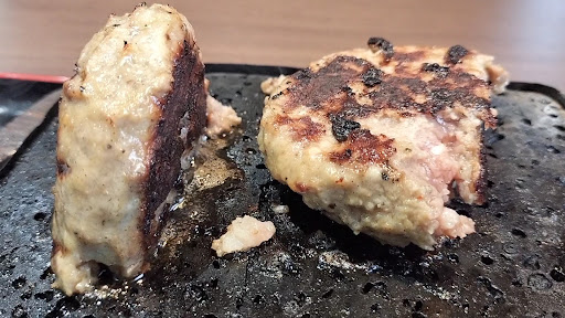 ■ロース&ハンバーグ 1500円 ブロックカットのロースステーキとハンバーグを鉄板に乗せて好きな火入れを個人でするスタイル。 ロースステーキは赤身メインで脂が少ないのは嬉しい。少し硬めの肉質。 ハンバーグも少し硬めの質感で肉肉しさはあまりないタイプ。 ソースがテーブル上にたくさんあるので味変出来て飽きがこない。
