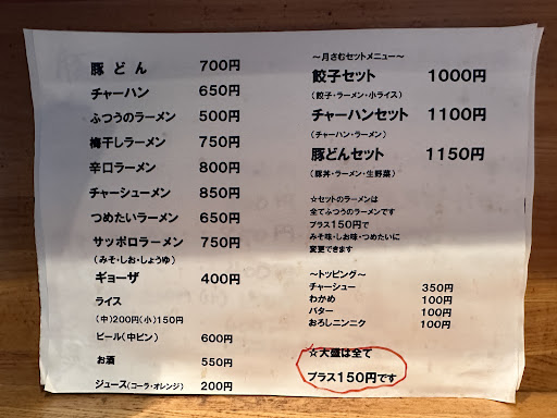 Read more月さむに行って来ました。豚どんセット1150円を注文、待ち時間20分でラーメン+5分で豚どんが到着しました。ラーメンはシンプルな味で悪く言えばスープも麺もぼやっとしている感じ、豚どんは具が思っていたより2倍くらい乗っていて食べ応えがありました。味はいたって普通ですが量がかなりあるので付け合わせのキャベツの千切りで箸休めをしたりマヨネーズで味変した方が良いかと思います。店主は寡黙で常に料理を作り続けている、奥様は女性1人のお客さまを優先的にテーブル席に案内するなど気遣いの出来る方でした。店の中はカウンター7席、テーブル席が3席、駐車場は共同駐車場ですが店の前と横に10台以上...