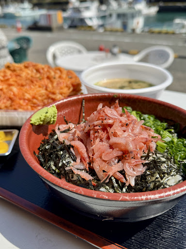 ●生桜えび丼 1000円 生桜えび丼は白いご飯の上に刻み海苔とたっぷりの生の桜えびが乗って、薬味のわさびと青ネギが添えられている。生の桜えびはぷりぷりで透明感があり、口に運ぶと殻のしゃくしゃくした歯応えと身の甘さが堪能できる。テーブルに特製のだし醤油があるが、醤油をつけなくてもそのままで桜えび独特の甘みとほんのりした塩気が感じられる。飲食スペースのところに温かいだし汁が入ったサーバーがあるので、お好みのタイミングでだし汁をたっぷりかけてお茶漬けにして味わうのもおすすめ。