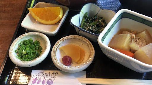 注文は「名物 自然薯とろろ定食」 とろろ は皮も一緒に刷り込んであって、粘り気が強いです。 好みでだし醤油(たぶん、鰹だしと醤油を割ったもの)を入れます。個人的にはタップリ入れても良いと思いました。 御飯は麦飯が混じっていて、小さい おひつ に入って提供されます。 薬味でネギとワサビ。 味噌汁は、油揚げ・ワカメ、控え目の味付けですね。 小鉢は2つ、鶏そぼろと豆、野菜の五目煮。 漬物は、たくわんの古漬け1まい、と鰹節の佃煮。 オレンジがデザートに付きます。