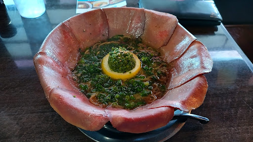 ) 着席して着丼は速かったな5分位で 先に肉寿司なる物が来てその後ラーメンが 来ましたよ....(゚ー゚*)! 近代まれに見るヒドさでした( ´_ゝ`) 私苦手な物以外は頼んだものは残さずちゃんと食べるんですが 今日はダメでした(/ー ̄;) ラーメンは一言でレモンネギ塩味です 牛骨感は…無いです さっぱりラーメンなのは分かるんだけど 上タン?💦その辺の生ハムより薄いし 上タンなんておこがましいんですけど? 近江牛?ホントに?どこの部位だよ! スジ肉みたいに硬いしその辺の交雑の牛でももっと美味しいの有るって(/ー ̄;)それでこの値段? スープに麺も負けてるし 東洋水産の5袋入りの塩ラーメンの方がはるかに美味しいよ 肉寿司に関しては(*`Д´)ノ!!!怒り 回転寿司の方が万倍まし 端っこの肉片をペロッと乗っけた様な物だしごはんは冷凍か?カピカピに乾いてて 激マズ!!(⊃ Д)⊃≡゚ ゚ 寿司とラーメンを焼津市でやるなら もう一度考えた方がいいと思います(... Read more