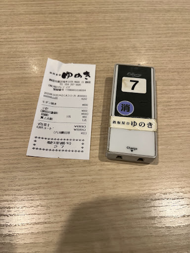 焼きそば、お好み焼きがメインのお店なので、鉄板焼きのモダン焼きをオーダー。 お知らせブザーを引き換えに、フードコート内の空いている席で待ちます。