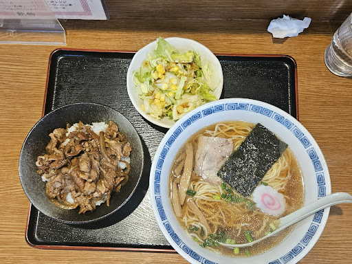 2025.01.10 昼ちょうどにランチに初訪問。 5人掛けテーブルが1卓あるほかは、カウンターがメインのお店でした。 入店時、全12席?くらいのカウンター席が残り3席空いており、待つことなく着席。 醤油ラーメンにミニ焼肉丼とミニサラダが付く、焼肉丼セット1,050円を選択。 混雑にも関わらず10分ほどで提供していただきました。