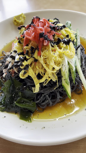 ・期間限定の黒ごま冷やし中華 1100円 黒ゴマを麺に練り込んであるので 真っ黒な麺です。 お味は少し甘め 麺は細くてもコシがあっていい感じ。 細麺好き! ここのは極細麺で有名! 冷やし中華の具もカニカマ、錦糸卵、チャーシュー、ワカメ、紅生姜、胡瓜、など入っていて具だくさん。 好きな味!