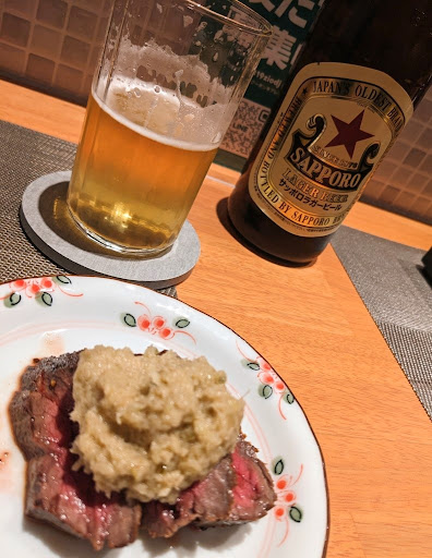 <セコンド・ピアット> 見事な赤、絶妙の焼き加減な牛肉のたたきに鎮座するソース。 ポルチーニ茸?ホースラディッシュ? 「トンナートソース」。マスターからの回答。 見事に予想を裏切られた。ツナマヨの味がするじゃないか。 イタリアでは定番ソースらしいが、人生で初めて肉と魚を一緒に食す。