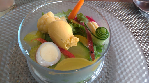 まずはお冷代わりのウェルカムドリンクが選べます。(野菜ジュース、ピンクグレープフルーツジュース、アイスティー、アイスコーヒー) それと新鮮サラダ。 何品もの野菜がとても新鮮で、ドレッシングがとてもおいしい。 相方は「生涯で一番おいしいサラダ」と一気に気に入りました。 メインは私は牛ミノの完熟トマト煮込み。 相方は甘鯛のロブスターソース掛け。 少しずつシェアして楽しみました。 これにパンと食後のソフトドリンクとデザートが付きます。 とてもオシャレでおいしいアーモンドを散らしたミルフィーユのデザートで〆ました。 サラダとデザートはオシャレでおいしい。 メインディッシュがいずれも小盛りなのが惜しい限り。